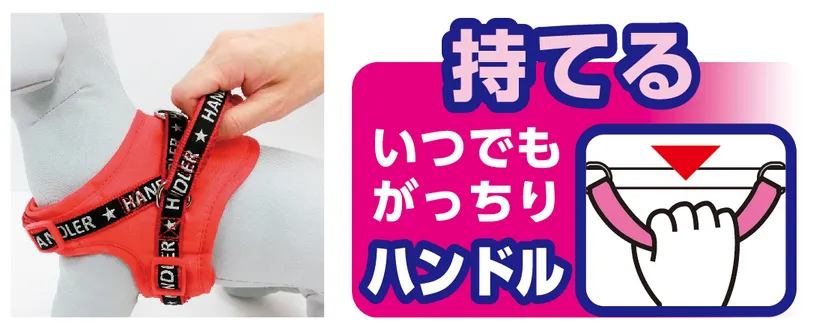 前後にスイングするハンドル付で、いつでもがっちり持てるので、とっさの抑止や高齢犬の補助にピッタリです。