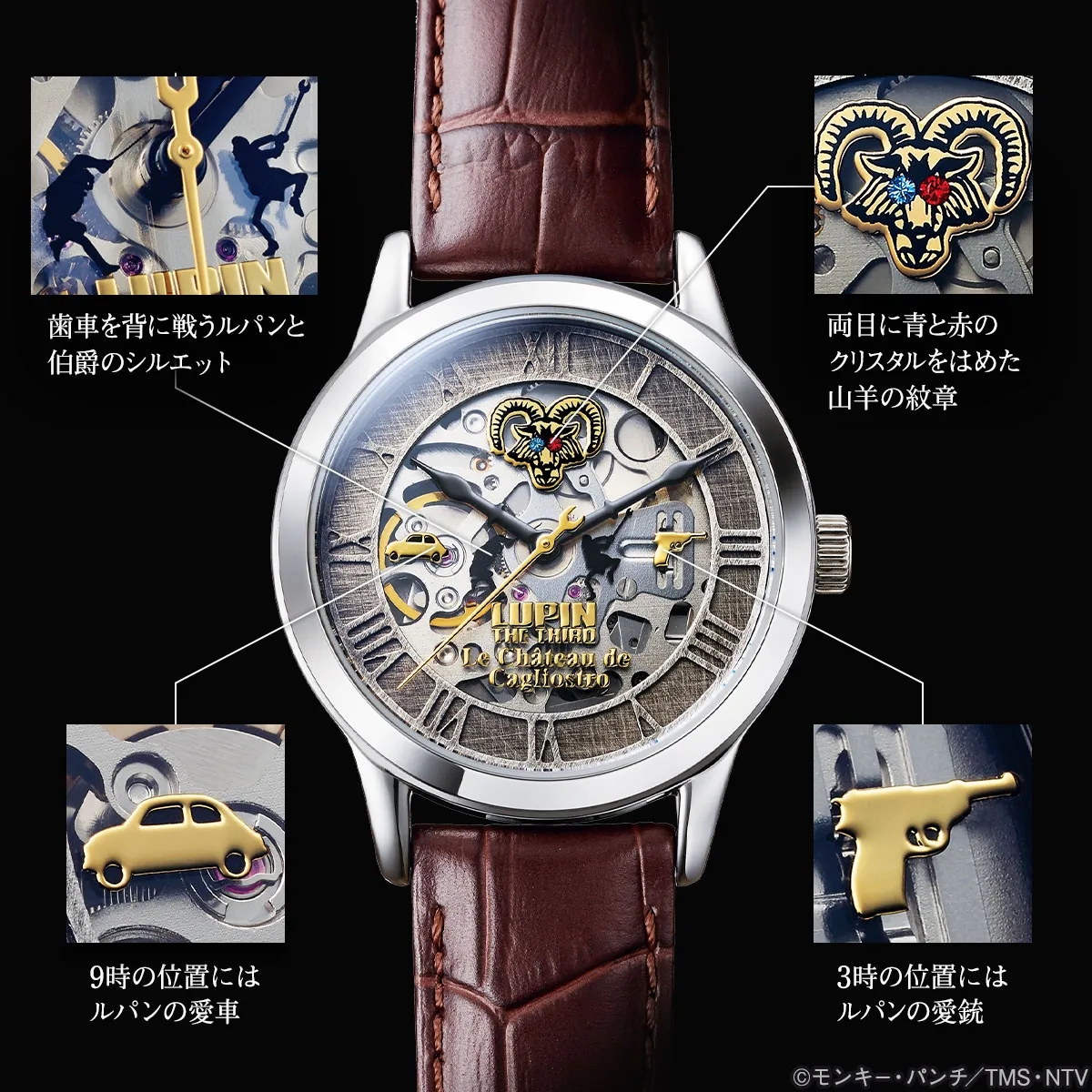 物語のクライマックス、時計塔での対決をイメージした機械式腕時計。スケルトン仕様の歯車がスリリングな時を刻む文字盤で、ルパンと伯爵のシルエットが相まみえます。
