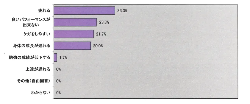 ▼栄養素が足りない弊害について、子供が「疲れる」ことだと考える親が一番多く、「良いパフォーマンスが出来ない」、「ケガをしやすい」、「体の成長が遅れる」という点が弊害だと考える親が続きます。疲労が蓄積されていくと多くのケガにも繋がりますから心配ですね。