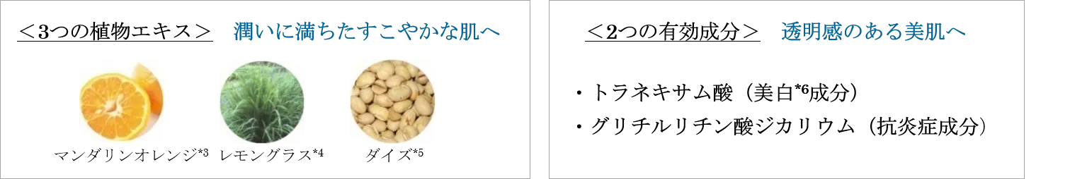 ◆3つの植物エキスと2つの有効成分を配合。透明感のあるすこやかな肌へ