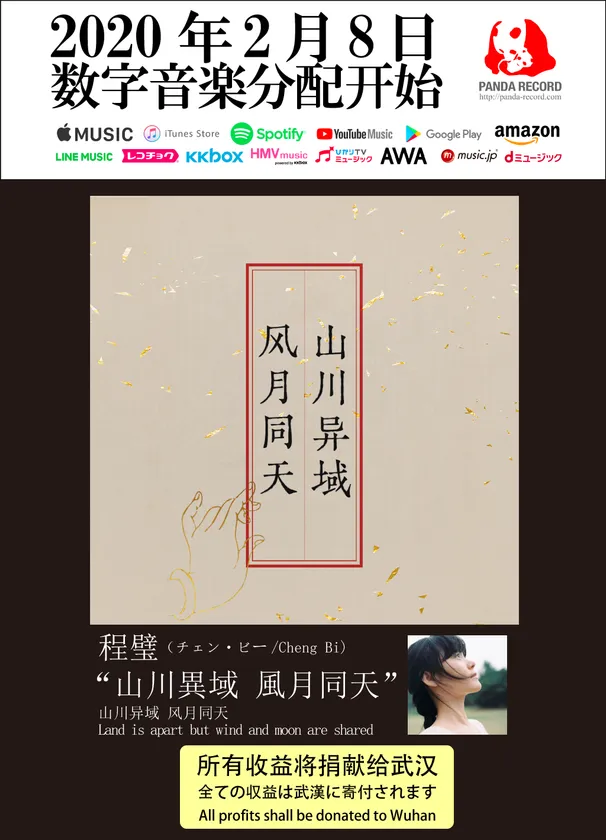 中国の音楽を日本に紹介する音楽レーベルのPANDA RECORD(運営会社:ANNA PATIO株式会社)は、中国のシンガーソングライター 程璧(チェン・ビー)が歌う武漢へ送るチャリティーソング「山川異域 風月同天」(山河は違えど 風月は同じ空に通ずる)を2020年2月8日に日本と中国で同時リリースしました。当曲の全ての収益金は、日本の中国大使館を通じて武漢市に寄付されます。