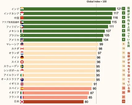 本調査では、「100」を自信の基準得点として使っています。得点が高いほど、その市場に暮らす人々がより強い自信を持っていることを表しています。