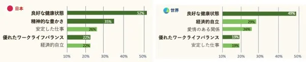 日本の世代別にひも解いてみると、「健康」を重視しているのはジェネレーションX世代(39-54歳)、ベビーブーマー世代(55-65歳)が6割以上であるのに対し、38歳以下の若い世代は4割以下にとどまっています。一方で、「精神的な豊かさ」の項目では最も若いジェネレーションZ世代(18-22歳)が45%となっています。同様に「優れたワークライフバランス」の項目においても、ジェネレーションZ世代は34%、ミレニアル世代(23-38歳)は24%であり、中高年よりも高いです。
