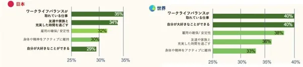「どのような仕事を求めますか?」という質問に対し、世界平均の結果では、「ワークライフバランスが優れている仕事」および「自分の大好きなことができる仕事」が同率1位で全体の4割を占めました。また、「家族や友達と充実した時間を過ごす」や「身体や精神をアクティブに維持する」も上位にランクしており、世界的にワークライフバランスを重要視していることがわかります。