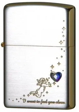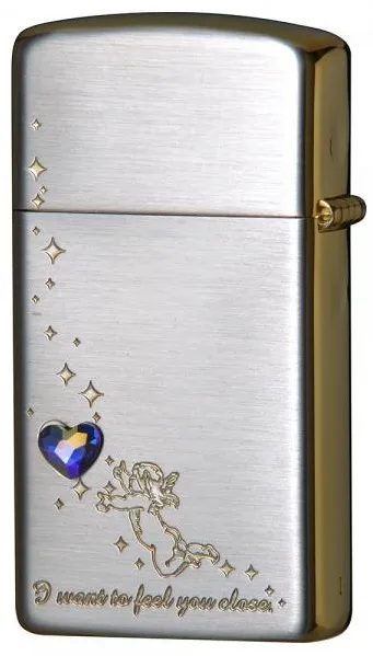 ギフトにぴったりの、ペアZippoライター。レギュラーサイズとスリムサイズの2種類が同梱されています。「あなたを近くに感じたい」という文字がエッチング加工で施され、ハート型のスワロフスキーがあしらわれた、カップルでのご利用に大変人気のアイテム。