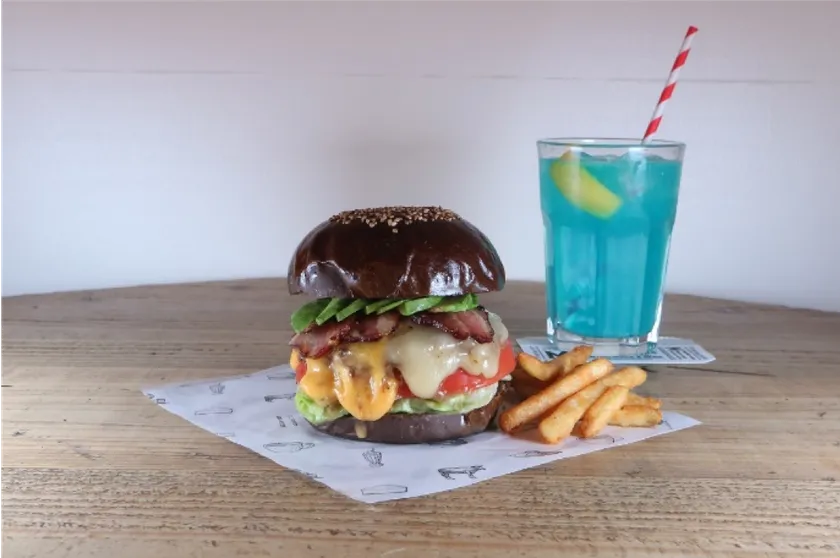 ドルビーシネマの階下、2階にあるモダンアメリカンダイナー「MOTION DINER」では、オープン記念として「SPECIAL BLACK BURGER & BLUE SKY LEMON SODA」セットを期間限定で販売いたします。特製の黒バンズと色鮮やかな映像をイメージしたトッピングのバーガーとブルーキュラソーで着色した自家製レモンソーダのスペシャルなセットです。