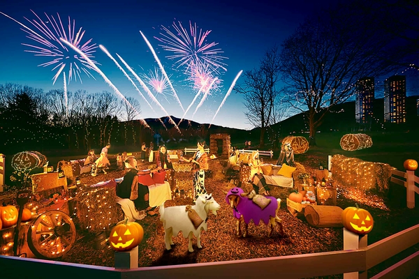 ハロウィン牧場ラウンジは、焚火や牧草ブロックのソファ、ジャックオーランタンが描かれた牧草ロールのイルミネーションなどを使ってハロウィン仕様に設えます。広大なファームエリアだからできる牧歌的で温かい雰囲気です。イベント会場では、ホットミルクを提供します。当リゾートにて放牧している牛から搾乳した「トマム牛乳」を使用します。動物おばけからもらった動物おばけクッキーとホットミルクの相性は抜群です。当イベントの最後には、パーティーを締めくくる花火を打ち上げます。