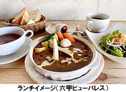 いちご狩りの後はバスで六甲山上へ移動し、海抜約880mにある展望レストラン「六甲ビューパレス」にて特別ランチを召し上がっていただきます。ビーフシチューの温野菜添えをメインに、季節のサラダ、スープ、二郎いちごのあん巻きが付いたランチです(大人用)。