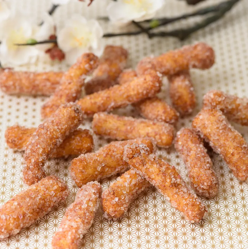「うめざらめ」は国産のもち米を使用し、甘辛に煮た愛知県産のたまり醤油を絡め、湯島天神の白梅をイメージした大粒の梅ざらめをまとわせた、あられです。ざらめと甘辛醤油の甘じょっぱさ、時々やってくる梅のほのかな酸っぱさが良いアクセントになり、次々と手が出てしまう、癖になる味わいです。さらに、もち米を一度焼いた後にサッと揚げる焼き揚げ製法により、サクッとした軽い食感に仕上げています。