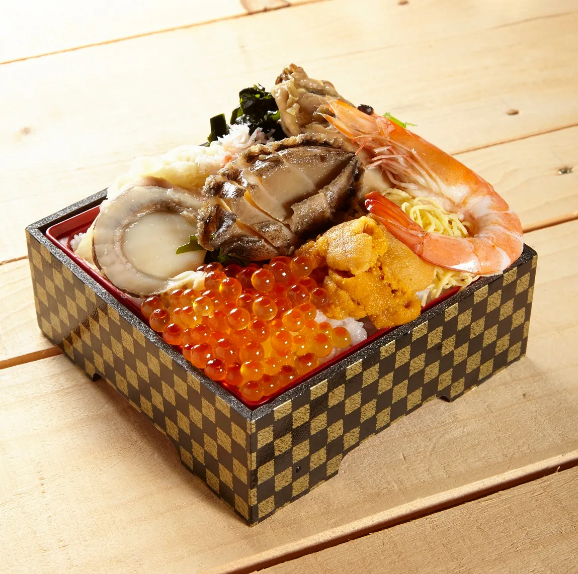 明治初期創業の老舗の鮮魚店が厳選した6種の海の幸をふんだんに使用した近鉄本店限定弁当。岩手県大船渡産の牡蠣をはじめ、あわび、いくら、ほたて、ウニ、えびが豪快に乗っています。