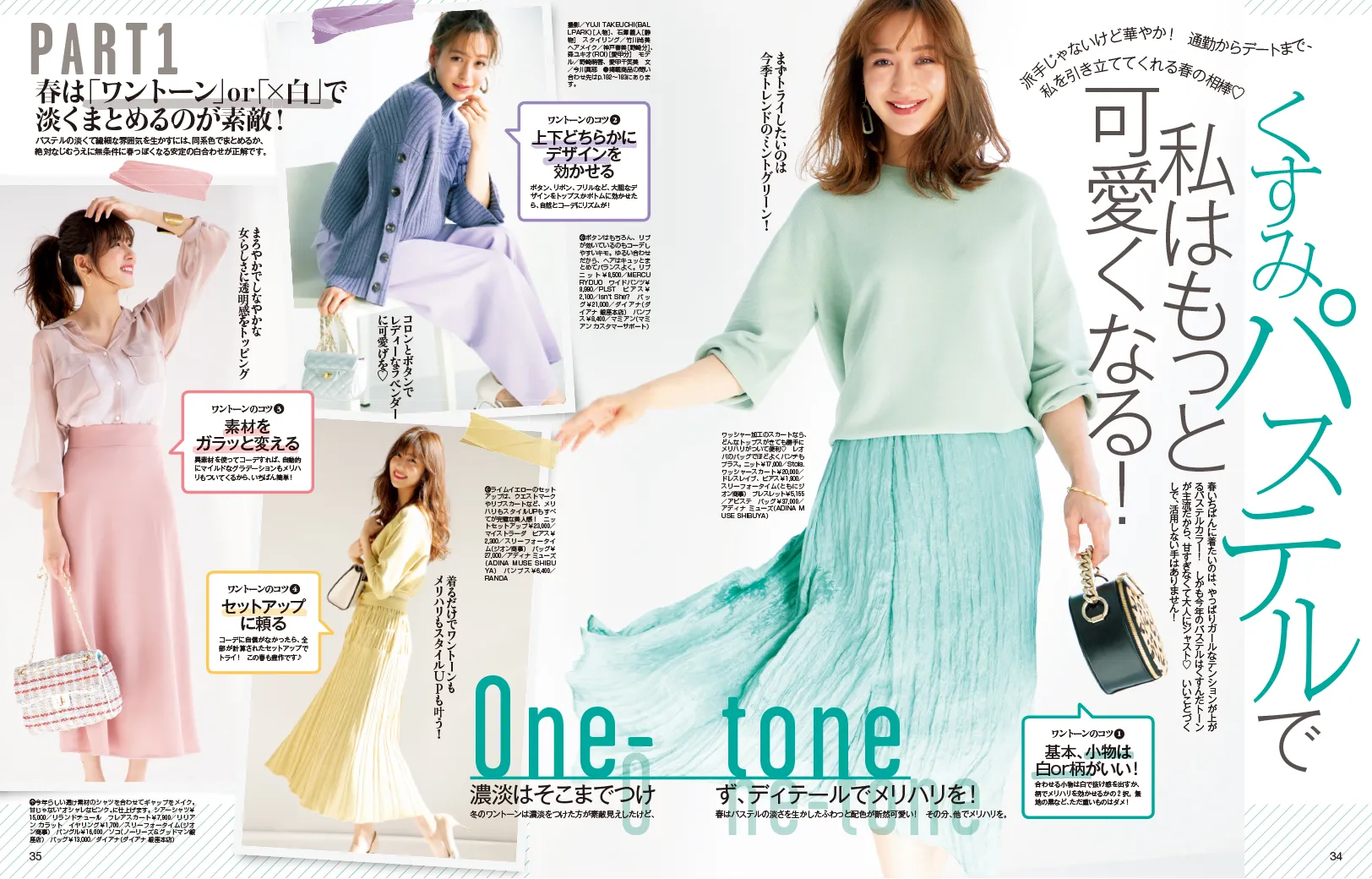 春は「ワントーン」or「×白」で淡くまとめるのが素敵!パステルの淡くて繊細な雰囲気を生かすには、同系色でまとめるか、絶対なじむうえに無条件に春っぽくなる安定の白合わせが正解です。