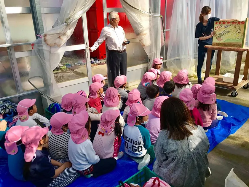 『農業王国豊川から「食生活」を豊かにする』をテーマに、2017年の農業参入時から始めた地元園児向けの食育イベントです。トマトが収穫できるようになるまで、黄色の花をが咲いたり、受粉に欠かせないハチの働きなど、紙芝居を使い、生育過程を伝えています。また、和みトマト「あかまる」の大玉・中玉・ミニ3種類のトマトの収穫を体験します。その場で口にした子供たちから「おいしいね」と声をもらうことが何より励みになります。またトマトが嫌いなお子様でも話を聞いて、お友達と一緒に自分で収穫した思い出を通じて、好きになってくれるはずと信じています。