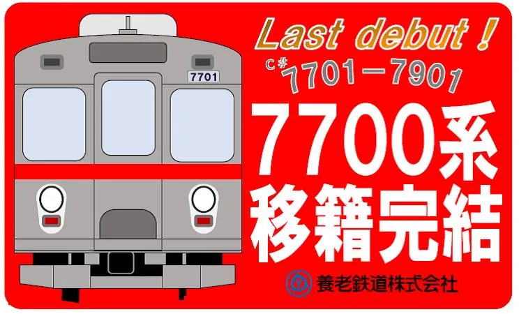 養老鉄道では、7700系車両のうち、TQ01編成(C#7701ー7901)が本年2月14日(金)に営業運転を開始します。これにより、予定していた7700系車両6編成の移籍が完結します。その記念として「7700系車両移籍完結記念系統板」をTQ01編成に掲出します。