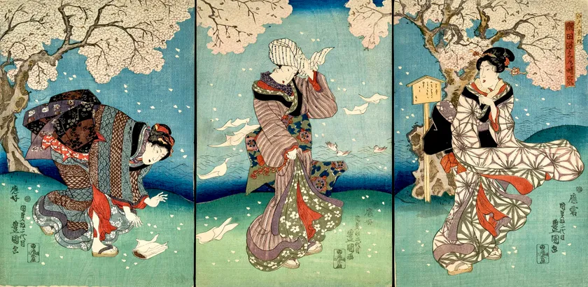 隅田川が江戸有数の行楽地となった文化文政期(1804~1830)を経て、天保期(1830~1844)末には、徹底した奢侈禁令を掲げる天保改革が始まりました。衣類や所持品の素材も細かく規制されるなど、庶民の生活にも立ち入ったもので、隅田川沿いの料亭や別荘、そして当世風俗を伝える一大メディアであった浮世絵も、取締りの対象とされました。厳しい制約を受け、絵師たちは芝居や古典文学の登場人物、着物の柄など無難なテーマにかこつけて当世の美人を描き、美人画への需要に応えました。