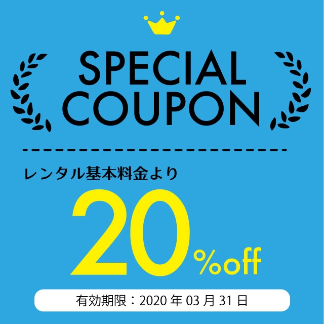 ・ご予約時にクーポンコードをご入力ください。・「レンタル819北長瀬店、岡山駅前店、岡南店」のご予約のみご利用いただけます。・本キャンペーンについて予告なく変更する場合がございます。予めご了承ください。