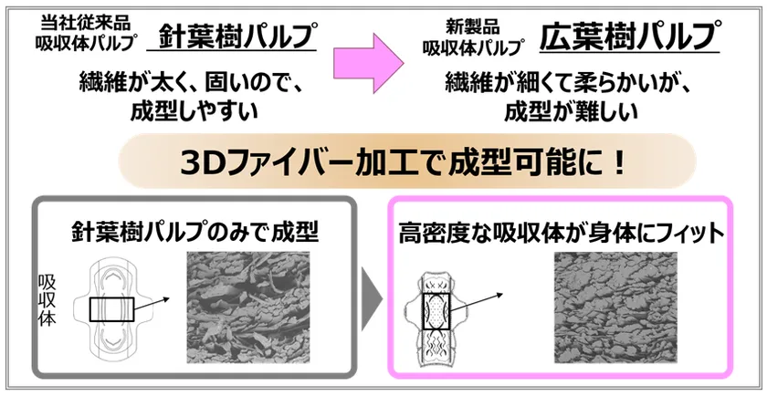 今回新たに、生理中のズレを解決するため、繊維が細くて柔らかい広葉樹パルプを使用し、身体にフィットする新たな吸収体の開発に取り組みました。しかし、広葉樹パルプの繊維が柔らかいという性質上、成型が難しいという課題がありました。