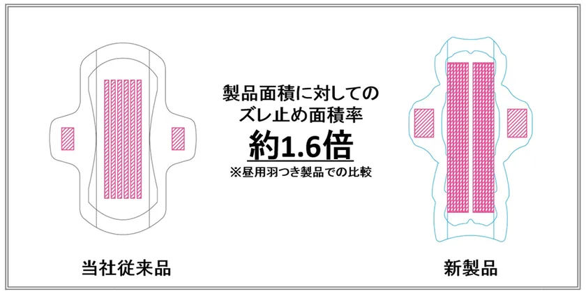 当社従来製品に対してズレ止め面積率が約1.6倍※4のため、汗をかいてもナプキンがショーツからはがれにくい構造です。