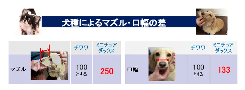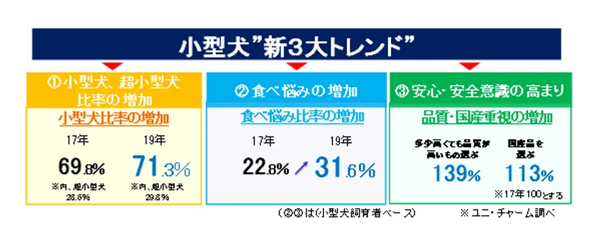 近年、小型犬の市場において、「(1)小型犬・超小型犬比率の増加 (2)食べ悩み※1の増加 (3)安心・安全意識の高まり」という3つの大きなトレンドが発生しています。また、小型犬の中でも、“マズル※2の長さ”や“口幅”は大きく異なる特徴を持ち、飼い主の方の粒の大きさへのニーズも多様化してきています。