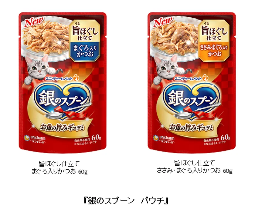 ユニ・チャーム株式会社(本社:東京都港区、代表取締役 社長執行役員:高原豪久)は、猫用ウェットフードから、お魚フレークがたっぷりはいった、食べ応えのある『銀のスプーン パウチ 旨ほぐし仕立て』を2020年3月30日より全国で新発売します。