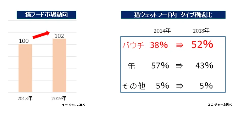 猫用フード市場は増加傾向にあり、2019年は前年と比較して102%成長しています。また、ウェットフードの中では、パウチタイプの構成比が年々拡大しています。