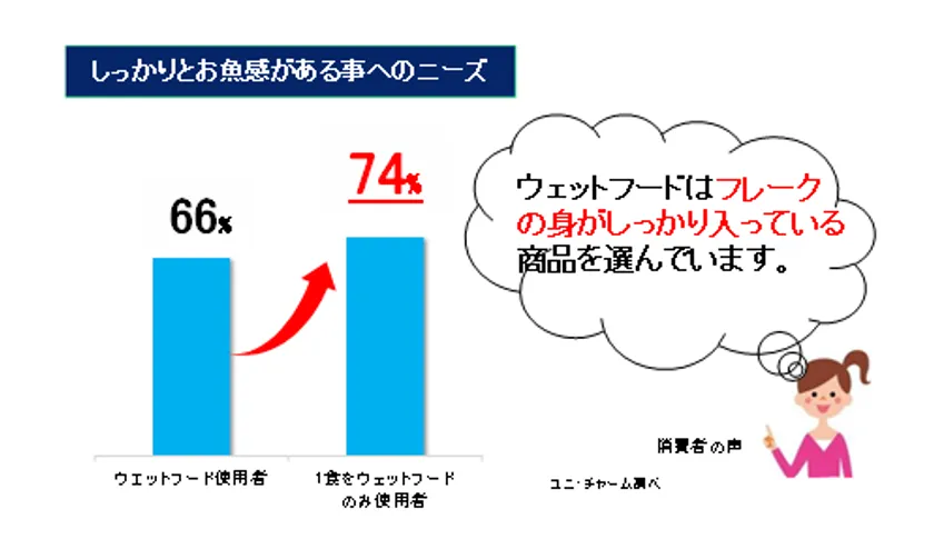 一方、猫のウェットフードの与え方は世帯によって様々です。その中でも、1食をウェットフードのみで与えている方は、フレークの身がしっかり入っている商品を好んでおり、身の量の多さなど「食べ応え」のニーズが高い傾向にあります。