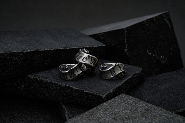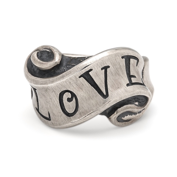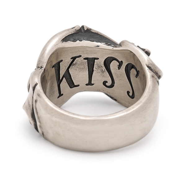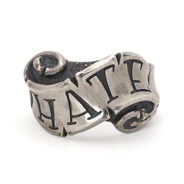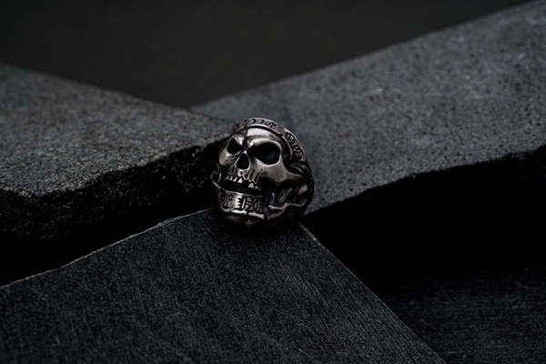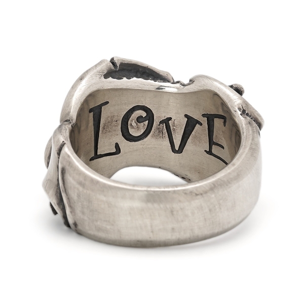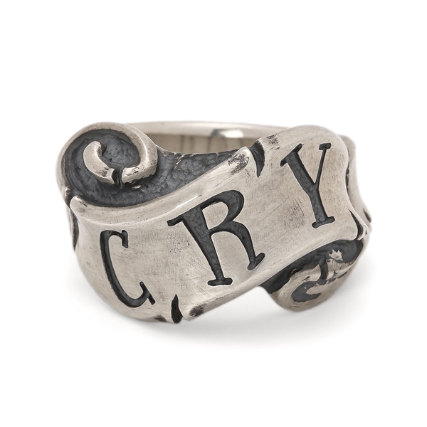 “Give No, Take No”とオールドイングリッシュ書体で刻んだリボンの隙間からスカルが覗くギャングスピリッツ溢れる初期作ながら変わらぬ人気のリング。