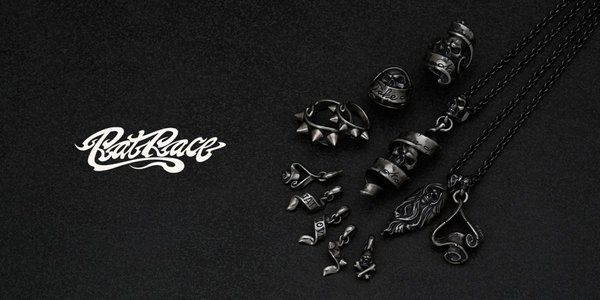 1997年に創設者かつデザイナーであるRat Gjo(ラットジージョ)が自身の納得のいく究極のスカルを追求する為に始動。自然というモチーフの中の究極の造形物の一つとしてスカルを捉え、その曲線やバランスに独自のデザインを落とし込む。キングオブスカルと評されるシルバーアクセサリーブランド。創設以来、精緻な造形と存在感あふれるデザインで国内外のファンを魅了してきたRAT RACE。「Today is a very good day, to Die」(死に日和)を座右の銘に、妥協なき物作りを追及している。全ての商品一つ一つバフ(研磨器具)を使わずにリューターのみを用いて磨き上げるという徹底した手法を採用。独特の仕上げに拘っており、すべての作品一点一点に魂を込めた手彫りのサインを入れて仕上げを行い、妥協なき姿勢をみせている。骸骨や有機的なモチーフ独自の解釈で表現し、シルバーという素材の可能性極限まで引き出す作品は、単なるアクセサリーを超えた「身にまをとうアート」として高く評価されている。