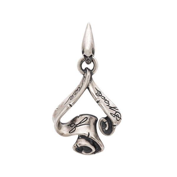 リボンを滑らかにスクロールさせ、スペードを描いたトップ。リボンには「Ace of Spade」と刻まれている。バチカン部分はスペードモチーフを取り入れ、スカルが覗くモチーフになっている。愛らしい小振りなサイズのAce of Spade RibbonTop S とペアにもおススメ。¥33,000(税込) ※チェーンは別売りです