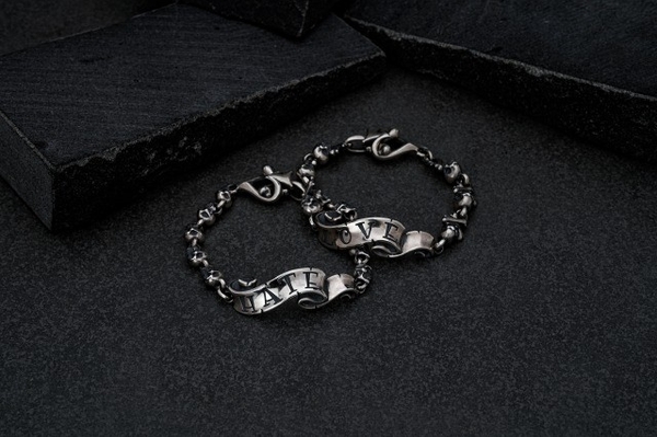 同シリーズのブレスレット。アメリカの握手文化(右手を差し出してLOVE(好き)、左手を差し出してHATE(嫌い))を基にした一種のジョークを表現している。 各¥75,900(税込)