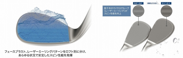ロフト別に異なるフェースブラストとレーザーミーリングを搭載し、フェース表面の摩擦を高めました。ラフやウエット時に芝や砂、水分などがボールとフェースに入り込むような悪条件下でのスピン性能を向上させます。