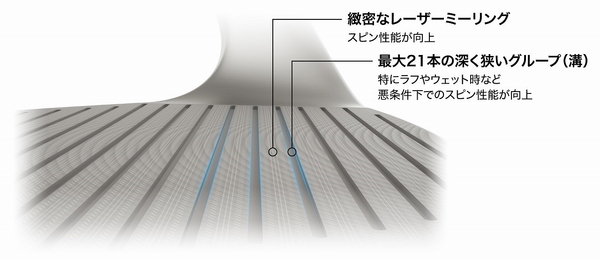 最大で21本の深く狭い高精度設計グルーブが強烈なスピンを生み出し、特にラフやウエット時など悪条件下でも優れたスピンコントロール性能を発揮します。