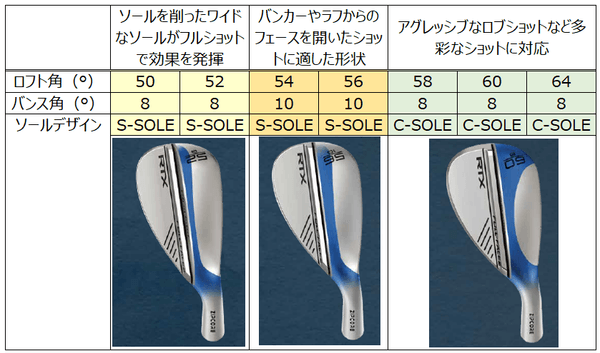 さまざまなシーンを想定し、ロフト別にソールを最適設計。バンカーや芝が薄いライからでも抜けが良く、フェースを開くショットでの操作性が向上しました。