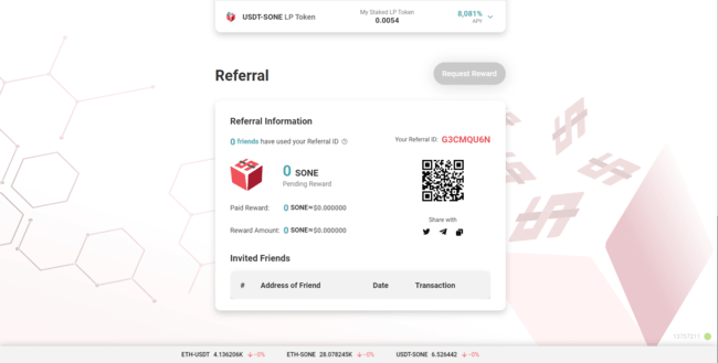 現在、ステーキング報酬の付与率がハイパーインフレ期間によって爆増しており、通常より多くの報酬を得ることが可能になっています。また、同時にS-ONE Financeローンチ記念としてのキャンペーンも開催中であり、一定額以上の流動性提供を行うと、紹介IDとSONEトークンがプレゼントされる内容となっています。