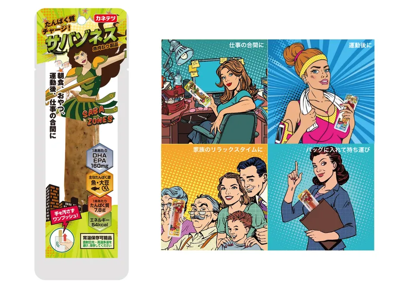 2019年7月発売の「カニカマッチョ」「チキンにくん」に続く「サバゾネス」は女性に人気の健康食材「サバ」を配合し、1本で7.8gのたんぱく質、160mgのDHA・EPAを含む蒸しかまぼこです。いつでもどこでも食べやすい常温保存可能なスティック形状で、日々のたんぱく質摂取をサポートします。