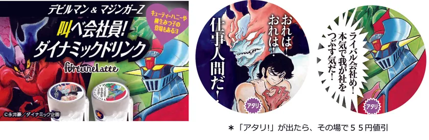 株式会社BANDAI SPIRITS フードエンターテインメント開発部は、当社が手掛けるキャラクタープリントドリンクが楽しめるシステム「フォーチューンラテ」と、「デビルマン」「マジンガーZ」などを手掛ける永井豪作品とのコラボレーションメニューの企画を、2020年2月20日(木)より養老乃瀧株式会社が運営する「だんまや水産」(池袋・仙台)・「一軒め酒場」(大阪)の3店舗を皮切りに全国展開に向けてスタートします。