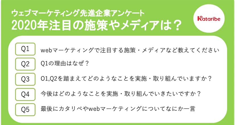 株式会社カタリベ(本社:東京都新宿区、代表取締役:永瀬 義将、以下 カタリベ)は、ウェブマーケティングに取り組む7社に、アンケートを実施したことをお知らせいたします。SNSや動画、新しいネットビジネスまで、注目のマーケティングトピックスについて示唆に富んだ内容となりました。このインタビュー内容は以下のURLにて公開中です。