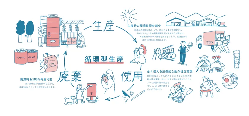 ものを作り、使い終わったらゴミになるという一方通行な仕組みが環境に大きな負担を与えています。生産、使用、廃棄、製品が関わる全ての工程を見直し、限りある資源を最大限循環させることで、プラスチックを使用しても環境負荷の少ないサステナブルな商品を、私たちは提供いたします。