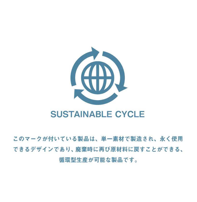 このマークがついている製品は、単一素材で製造され、廃棄時に再び原材料に戻すことができる、循環型生産が可能な製品表示です。今後、新製品にも採用していきます。