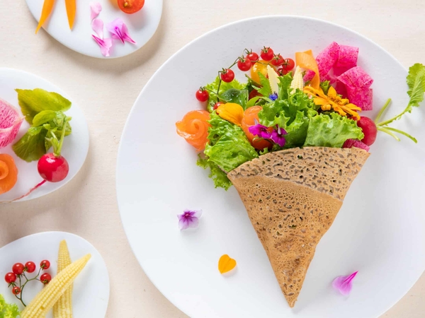 彩り豊かな春の野菜やエディブルフラワーを使用して、お子様が自由にガレットにデコレーションができる「花咲くガレット」を提供します。花束の形をしているので、母の日のプレゼントにもぴったりな春限定のメニューです。完成したガレットを家族みんなで食べながら、ホタルストリートに広がる花咲くストリートを眺めることができます。