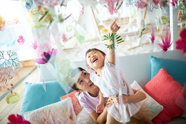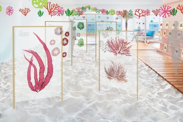 熱海の絶景と温泉に浸るリゾートホテル「リゾナーレ熱海」では、ホテル最上階の「ソラノビーチBooks&Cafe」にて「海の花咲くリゾナーレ」を開催します。鮮やかな色や形から海藻を「海の花」とした、日本最多の約400種類の海藻が生息している伊豆ならではのイベントです。光の当たり具合によって紅色、褐色、緑色と異なる色に育つ海藻の特徴をイメージし、カフェの奥に進むにつれて色が変わる「海の花咲くアート」など、海藻の華やかさを活かした装飾が設えられます。