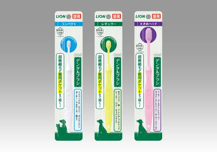 そこで、超極細毛が歯周ポケットまで届いて歯垢をかき出しやすいペット用歯ブラシ『PETKISS デンタルブラシ』を、3種類のヘッドサイズを品揃えして新発売いたします。