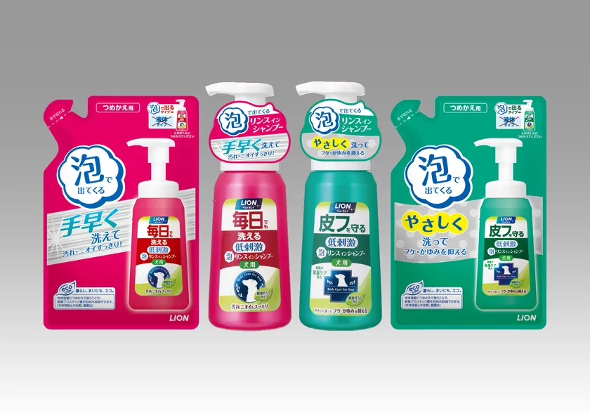 そこでこの度、プッシュするだけでクリーミィな泡が出てくる低刺激タイプのリンスインシャンプー『ペットキレイ 毎日でも洗える泡リンスインシャンプー 犬用』『ペットキレイ 皮フを守る泡リンスインシャンプー 犬用』を新発売いたします。