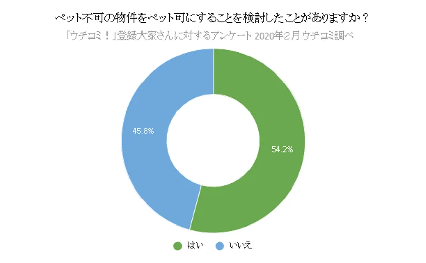 一方で、大家さんに対する「ペット(犬、猫)飼育可の物件はお持ちですか?」という質問には、48.9%の大家さんが「飼育可の物件を持っている」と回答。さらに、「ペット不可の物件をペット可にすることを検討したことがありますか?」という質問には、半数以上の54.2%が「検討したことがある」と回答しました。