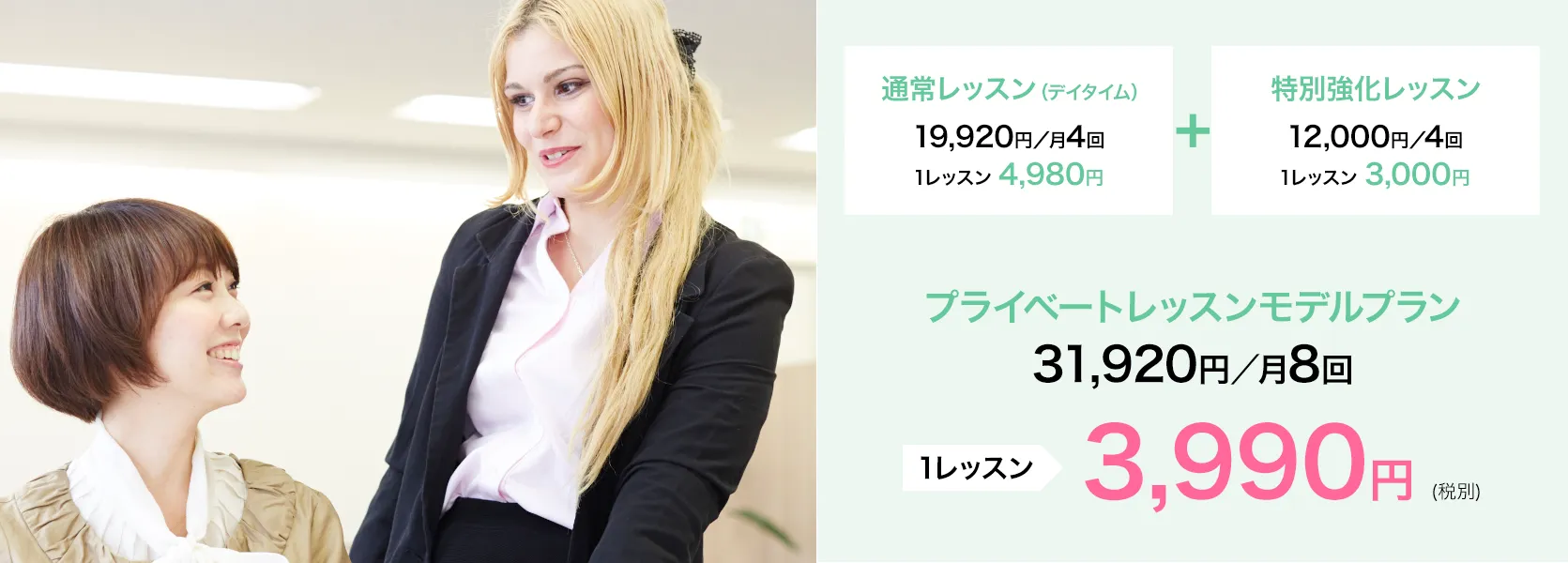 特別強化レッスンと組み合わせると、月8回の受講ペースで1レッスン3,990円(税別)とさらにお得な料金に!! 効率的に学習できるカリキュラムで、料金以上の効果をご実感していただけます。