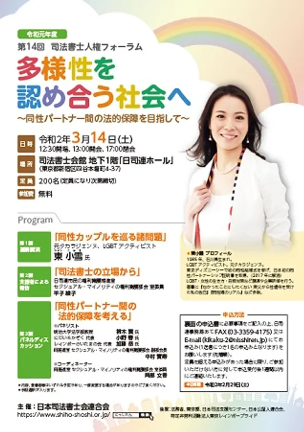 日本司法書士会連合会(所在地:東京都新宿区、会長:今川 嘉典)は、令和2年3月14日(土)に四ツ谷・日司連ホールにて、第14回司法書士人権フォーラム「多様性を認め合う社会へ ~同性パートナー間の法的保障を目指して~」を開催いたします。