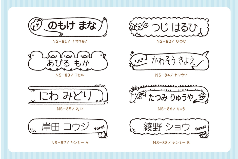 ナマケモノ、ヒツジ、ワニ、龍、カワウソ、アヒル、ヤンキーデザインの8種類を、2022年11月初旬、新たに仲間入り。オムツスタンプ以外の用途としても使いたくなる、愛着の湧くイラストです。