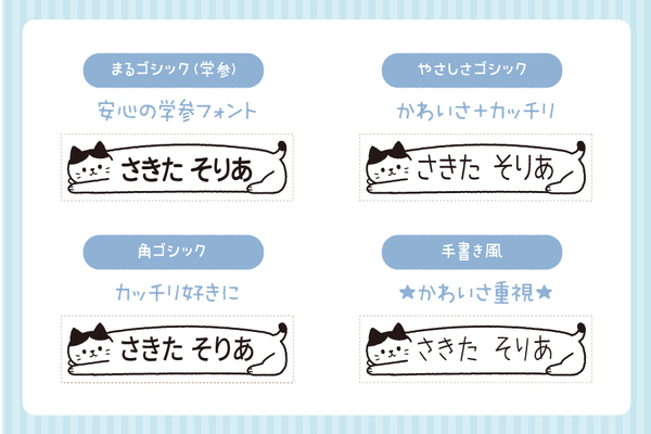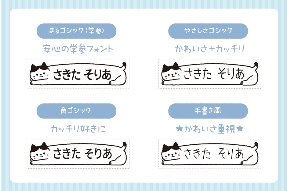 学参・旧字に対応した「まるゴシック」からかわいい「手書き風」まで、全4種類のフォント(書体)から選ぶことができるようになりました。また、ひらがなだけではなく漢字やローマ字にも対応しています。