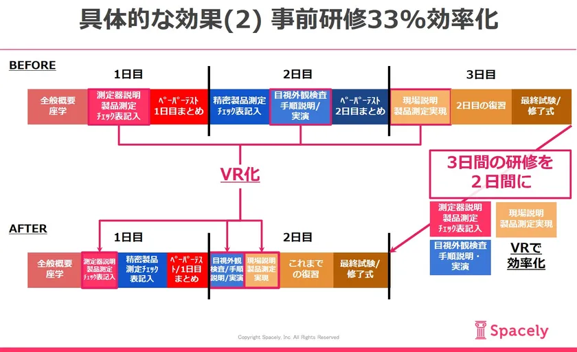 製造現場の研修内容は、ベテラン作業員が培ってきた経験・ノウハウの結晶であり、それをVRコンテンツに織り込む作業は、現場のセンスやコツがなければ難しいものですが、今回の現場実証では、大同メタル工業の現場の研修担当者が、アイデアが思い浮かんだその場でマイクロラーニングのVRコンテンツを制作しました。また、スペースリーのクラウドソフトも、本現場実証を通して、大同メタル工業の現場のニーズに応え、それらに対応した新機能を拡充したことにより、研修現場向けに一層使いやすいものとなりました。