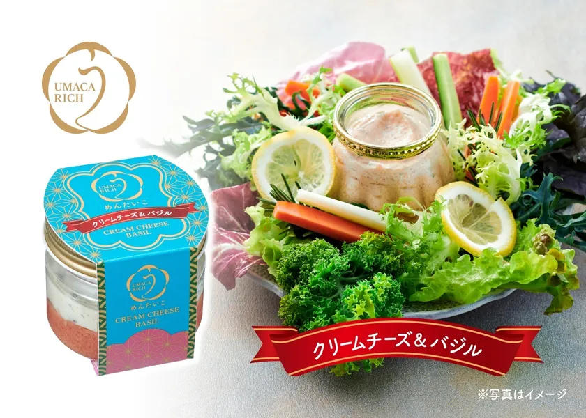 商品特長:濃厚なクリームチーズと爽やかに香るバジルが明太子とよく合います。