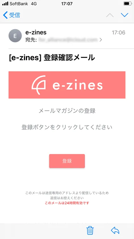 空メールを送信するとすぐに登録確認メールが届きますので、登録ボタンをクリックしてください。